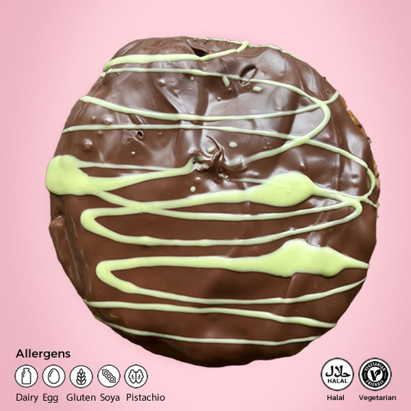 Our triple chocolate cookie with a layer of Kunafa pistachio cream then dipped in chocolate